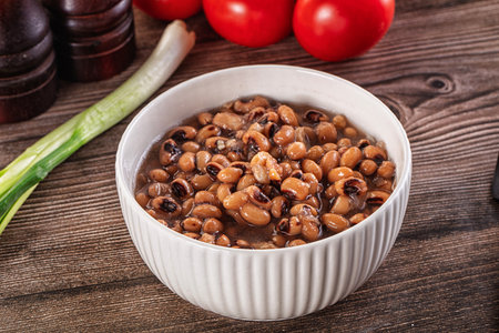 A vibrant bowl of cooked black-eyed peas rests on a weathered wooden table. The earthy tones of the peas complement the rustic charm of the spoon, inviting a taste of tradition.