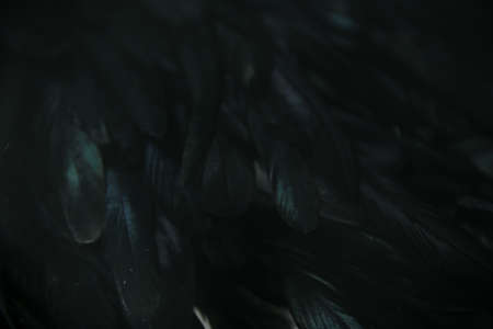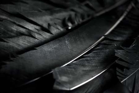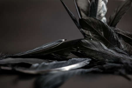 Halloween background with black raven feathers on dark grunge backdrop. Horror gothic abstract design with copyspace. Closeup of bird wing texture.