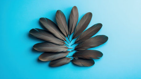 A striking composition of black feathers arranged symmetrically against a vibrant blue backdrop. This image captures the beauty and elegance of nature.