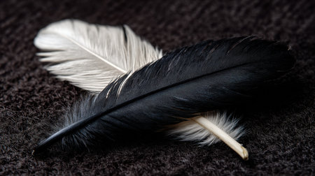 Beautiful black and white feathers rest gracefully on a dark fabric surface, showcasing natural elegance and intricate details for artistic and creative projects.