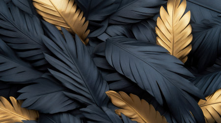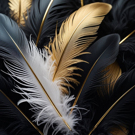 A close-up view of a collection of black and gold feathers, creating a luxurious and artistic texture.