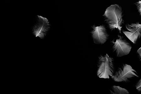 Creative black background with white feathers. Abstract backdrop of swan feathers. Natural backdrop. Copy space. Minimal