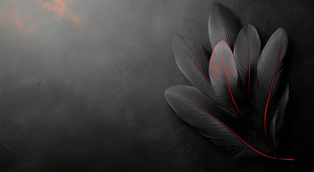 Black feathers with striking red edges are artistically arranged on a dark textured background, creating a sophisticated and modern aesthetic.