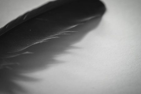 Close up elegant and classy black feather texture of bird with shadow and white background.
