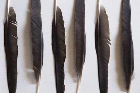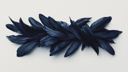 This stock photo features an elegant arrangement of dark feathers on a white background, conveying a sense of beauty, minimalism, and artistic charm.
