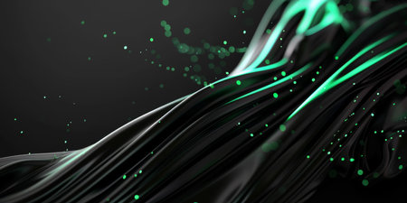 An abstract background in black and neon green with flowing curves and glowing particles creates a futuristic design