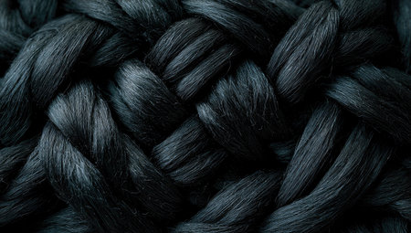 A detailed view of a tightly woven dark textile, highlighting the craftsmanship in the braiding technique and the texture of the material.