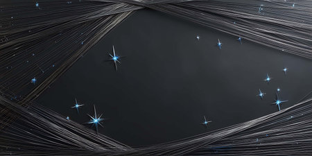 Panoramic full-frame shot of black hair interspersed with tiny reflective particles resembling stars or galaxies, surreal macro texture
