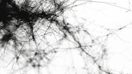 Thin, intricate lines intertwine against a soft white backdrop, creating an abstract representation reminiscent of natural web formations. The design conveys a sense of depth and complexity..
