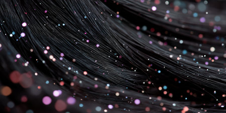 full-frame shot of black hair with tiny reflective particles embedded, resembling stars or galaxies, surreal macro texture