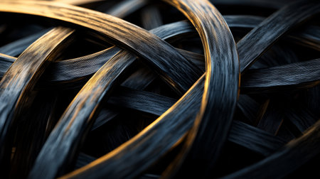 Close-up view of intricately woven strands creating an abstract pattern. The interplay of light and shadow enhances the texture and depth, emphasizing a unique artistic design.