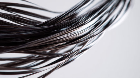 This stunning close-up image captures smooth black hair strands flowing gracefully, showcasing their elegance and shine against a simple background, ideal for beauty and fashion themes.