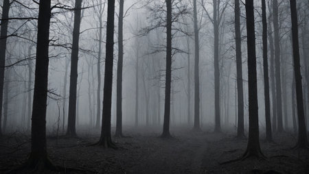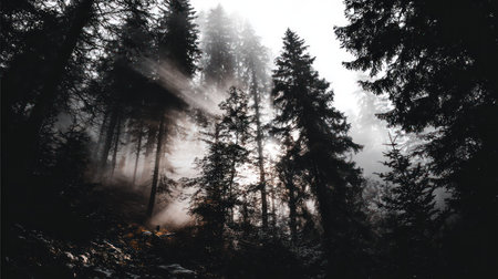 Dense forest shrouded in heavy fog creates an eerie and atmospheric scene with tall trees lining a path Perfect for illustrating mystery or nature's solitude.