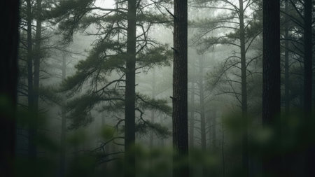 A beautifully tranquil forest scene featuring the silhouettes of tall pine trees that are enveloped in a blanket of thick fog, creating a serene, peaceful, and emotionally touching atmosphere for all