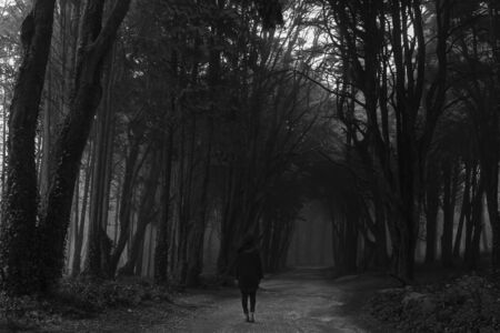 Creepy depressive black and white trees photo. Mysterious background for Halloween, scary articles, fairy tales.