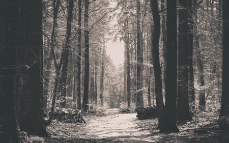 Springtime, forest awakens again after the winter break. The spring sun breaks through the trees on the path in forest. Nature concept. BW filter toned.