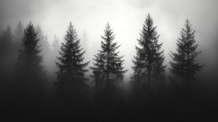 The silhouette of tall pine trees in thick fog creates a tranquil atmosphere, inspiring deep emotions in this picturesque minimalist landscape, leading one to gaze and get lost in thought