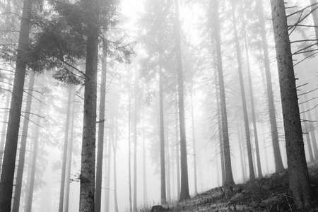 Mysterious foggy forest in the Carpathian mountains, Ukraine