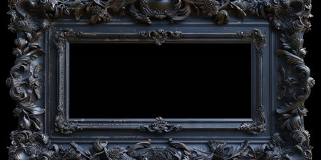 An ornate black and white picture frame with intricate decorative carvings and a greyish interior space.