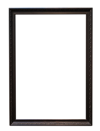 This image features a black picture frame isolated on a white background. The frame is rectangular and appears to be empty, providing a stark contrast between the dark frame and the bright background. It is centered in the image, making it the focal point.