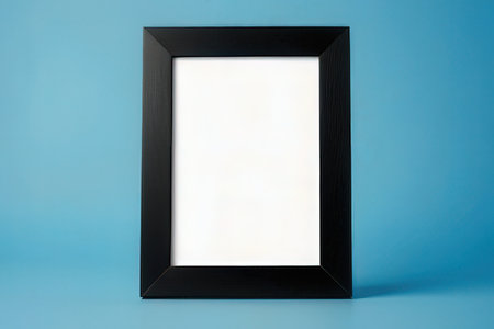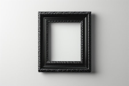 A black wooden wall art frame hanging on an empty white wall. Generative AI