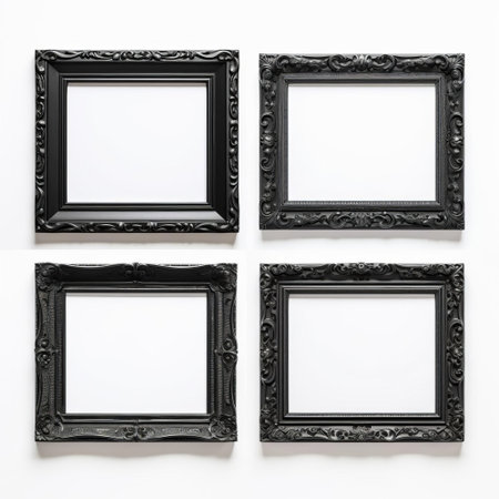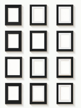 Collection of empty black frames arranged on a white background, ready to hold personal memories and pictures. Ideal for adding to a wall.