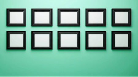 A collection of empty black frames arranged neatly on a mint green wall, ideal for showcasing artwork or photographs. Perfect for creative displays.