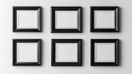 A set of six empty black frames arranged on a white wall, perfect for displaying artwork or photographs in a minimalist and modern style. Ideal for creative projects.