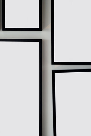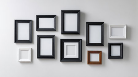 Collage of multiple picture frames in different sizes arranged on a white gallery wall, stylish home dcor with copy space