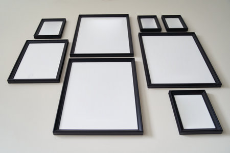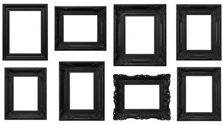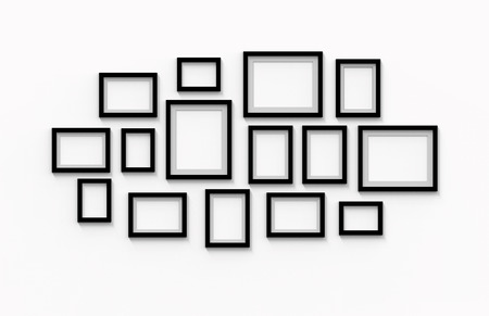 A collection of empty black frames is arranged on a clean white background ready for displaying pictures, art, or memories in various sizes.