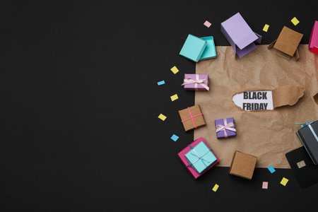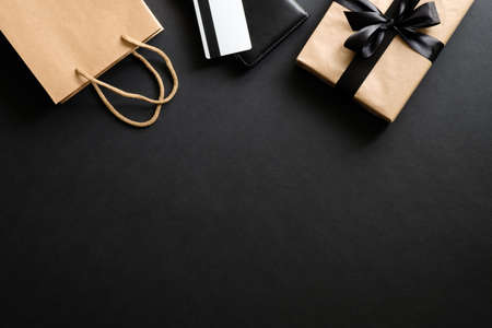 Black friday sale concept. Frame made of gift box, credit card, shopping bag over black background
