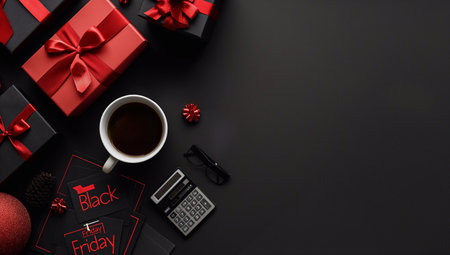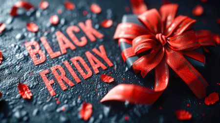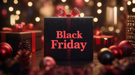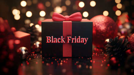 Black Friday sale concept, a black gift box with a red bow, surrounded by festive red ornaments and bokeh lights.