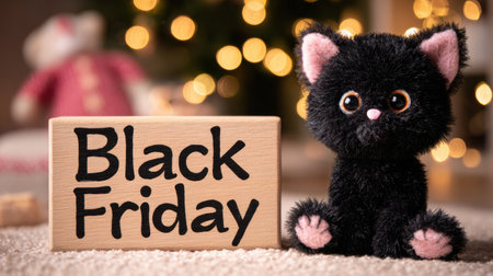 Black kawaii plush next to Black Friday sign, surrounded by warm glowing bokeh lights in a cozy interior setting