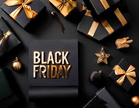 Black Friday sale text on black background with black gift boxes, golden christmas balls and decorations