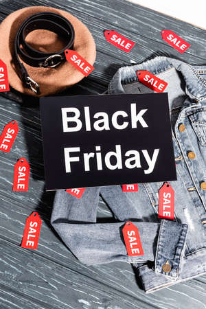 top view of placard with black friday lettering on blue denim jacket near beret and belt