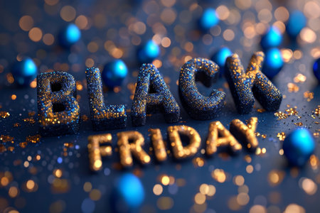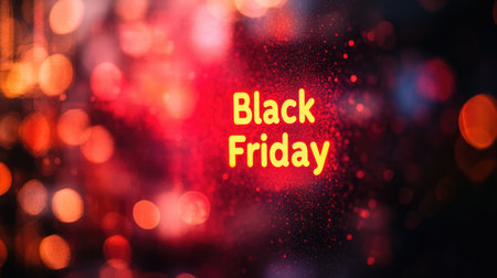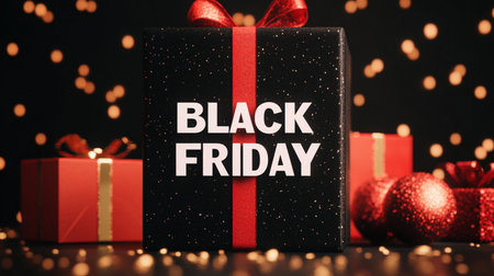 Black Friday theme with gift boxes, red ribbon, and sparkling bokeh lights, symbolizing retail sales and festive promotions.