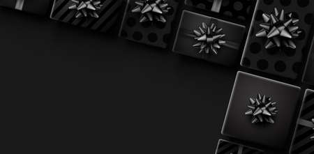 Monochrome black gift boxes with beautiful bow frame background. Space for text. Vector holiday illustration.