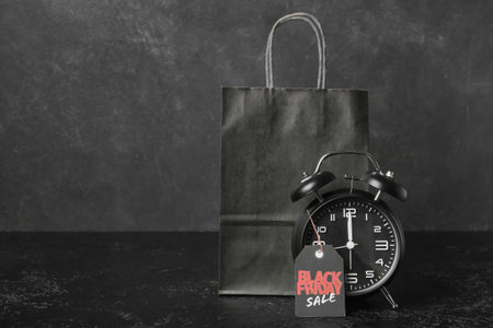Shopping bag, clock and tag with text BLACK FRIDAY SALE on dark background
