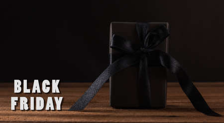 Black Friday sale concept, Gift box wrapped in black paper and black bow ribbon on wooden table studio shot on black background