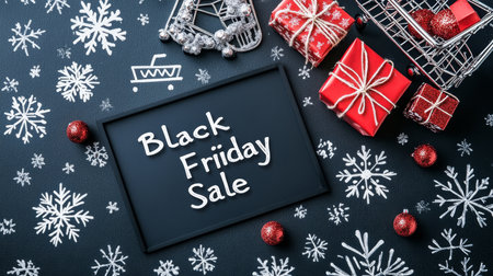 Black Friday Sale, Flat Lay with Gift Boxes, Shopping Cart, and Snowflakes on Black Background