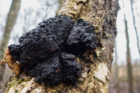 Chaga mushroom on a birch tree close-up. Has healing properties, treatment of diseases and cancer
