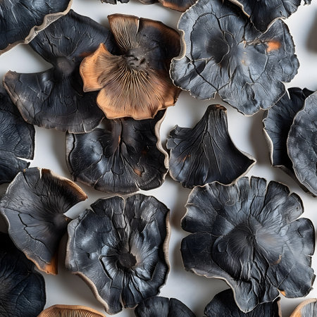 Three striking black mushrooms are positioned on a clean white surface, highlighting their distinct shapes and elaborate textures, creating a captivating natural display.