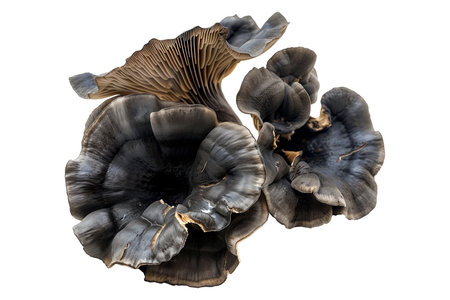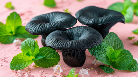 Black trumpet mushroom craterellus cornucopioides on soft delicate pastel background