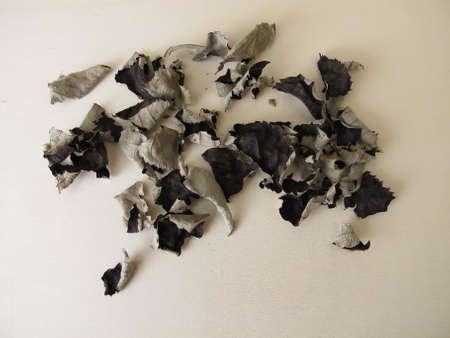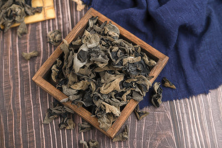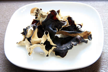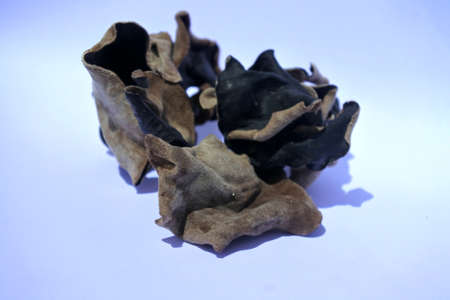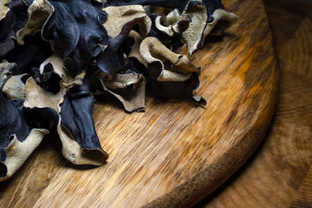 Close up of dry black sliced mushroom on wooden background. Edible dark fungus - auricularia polytricha. Nobody