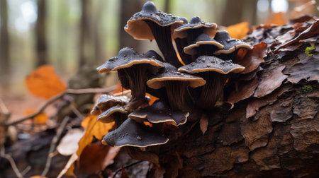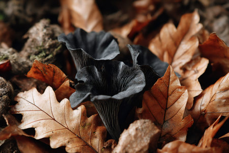 Black trumpet mushrooms sprout among fallen autumn leaves on a forest floor