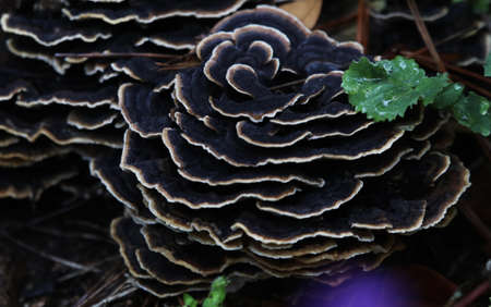 Trametes versicolor - hub, multi-colored mushrooms growing in a large group on a tree stump. It has medicinal properties. In some countries (eg China) considered edible