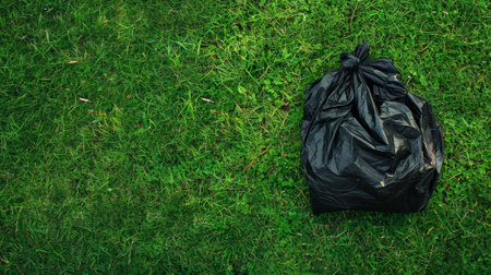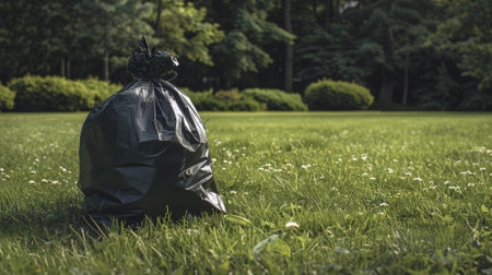 A black trash bag sits on the grass in a park. The bag is full and ready to be picked up. Concept of responsibility and cleanliness, as the bag is a reminder to keep the park tidy