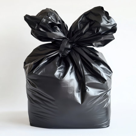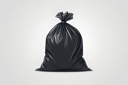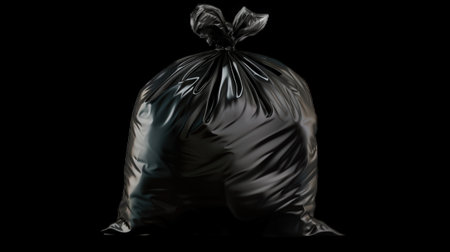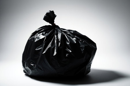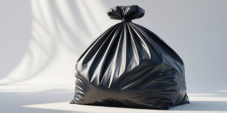 Black plastic garbage bag tied securely at the top, positioned on a light surface with soft shadows. The minimalistic background enhances the focus on the bag's texture and shape.
