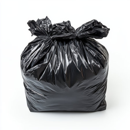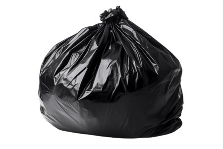 A large black plastic garbage bag tied securely at the top, ideal for waste disposal, organization, and cleanup tasks in various settings, promoting convenience and efficiency.