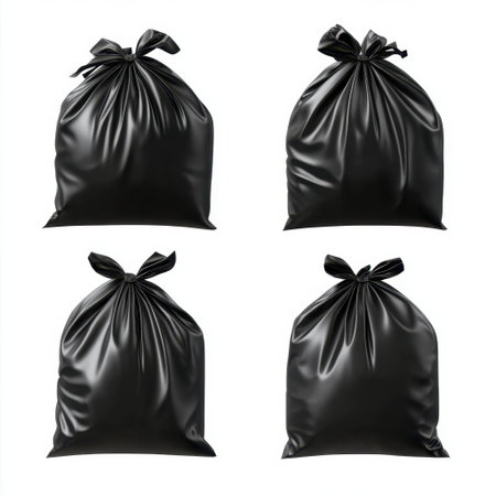 Four black plastic garbage bags are neatly arranged against a white wall, symbolizing waste disposal and cleanliness in any home or environment.